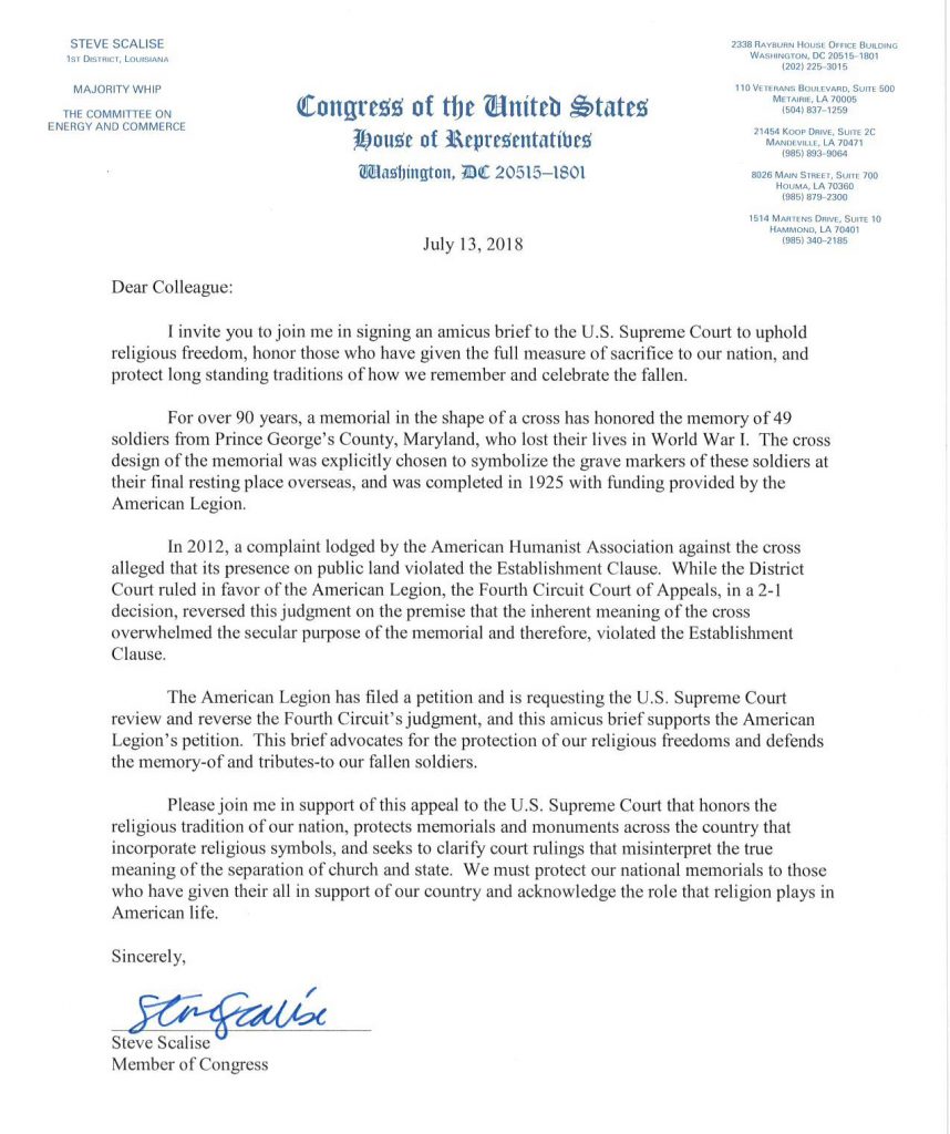 House Majority Whip Steve Scalise (R-La.) led 84 of his House colleagues and Senator Ted Cruz (R-Texas) led 23 of his Senate colleagues today in filing an amicus brief to stand up for religious freedom and the memory-of and tributes-to our fallen soldiers.