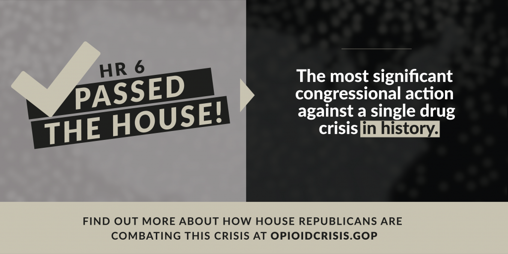 Over the last two weeks, the House passed more than 70 bills that have been packaged into H.R. 6 – the Substance Use-Disorder Prevention that Promotes Opioid Recovery and Treatment (SUPPORT) for Patients and Communities Act. These bipartisan efforts build on two major legislative initiatives that were enacted in the 114th Congress, known as the 21st Century Cures Act and the Comprehensive Addiction and Recovery Act (CARA), and will complement the $4 billion included in the FY 2018 Omnibus that was dedicated to fight this crisis.