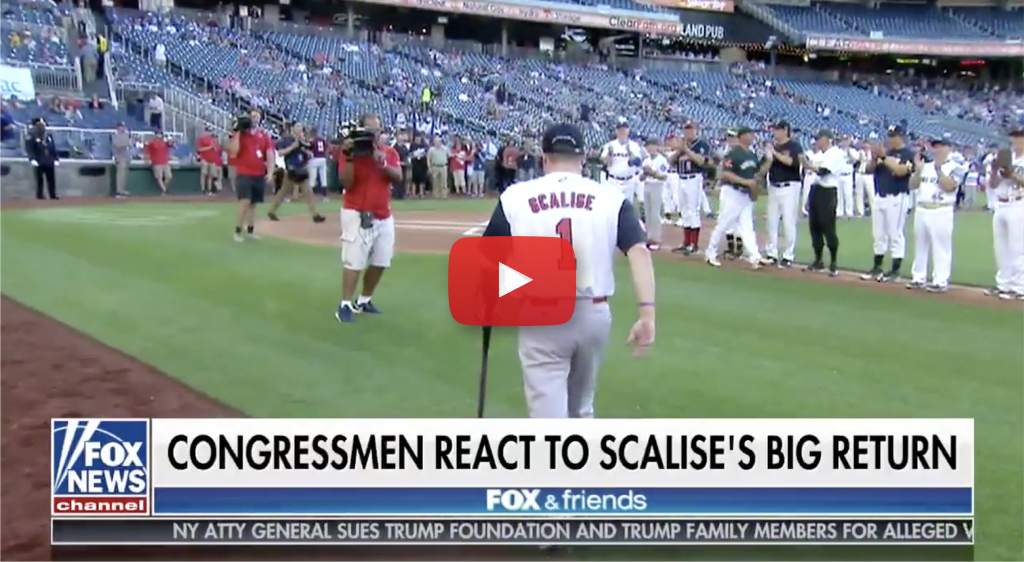House Majority Whip Steve Scalise (R-La.) made his return to the Congressional Baseball Game last night. One year after a near-fatal shooting at a Congressional Baseball practice, Whip Scalise stepped back on the field and started at second base where he made the first play of the game and secured the Republicans' first out. Fox News Channel's Fox & Friends followed Whip Scalise through this meaningful day from practice, to a Congressional blood drive, to the baseball game.