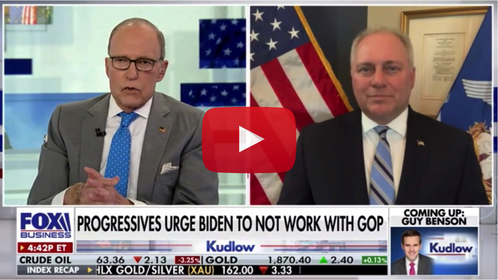 Today, House Republican Whip Steve Scalise (R-La.) joined Fox Business Network’s Kudlow to discuss President Biden’s attempt to sabotage the Tax Cuts and Jobs Act, failure to deliver on his campaign promise of “unity,” and consistent efforts to dismantle the United States' energy dominance. Whip Scalise called out President Biden for actively working against the American people by fighting to raise taxes on low-income families and prioritizing a trillion-dollar social agenda over rebuilding physical infrastructure. Whip Scalise also highlighted the hypocrisy of the Biden Administration in canceling the Keystone pipeline while handing Russia the gift of finishing its previously sanctioned Nord Stream 2 pipeline, which would hurt Americans at home and our allies abroad.