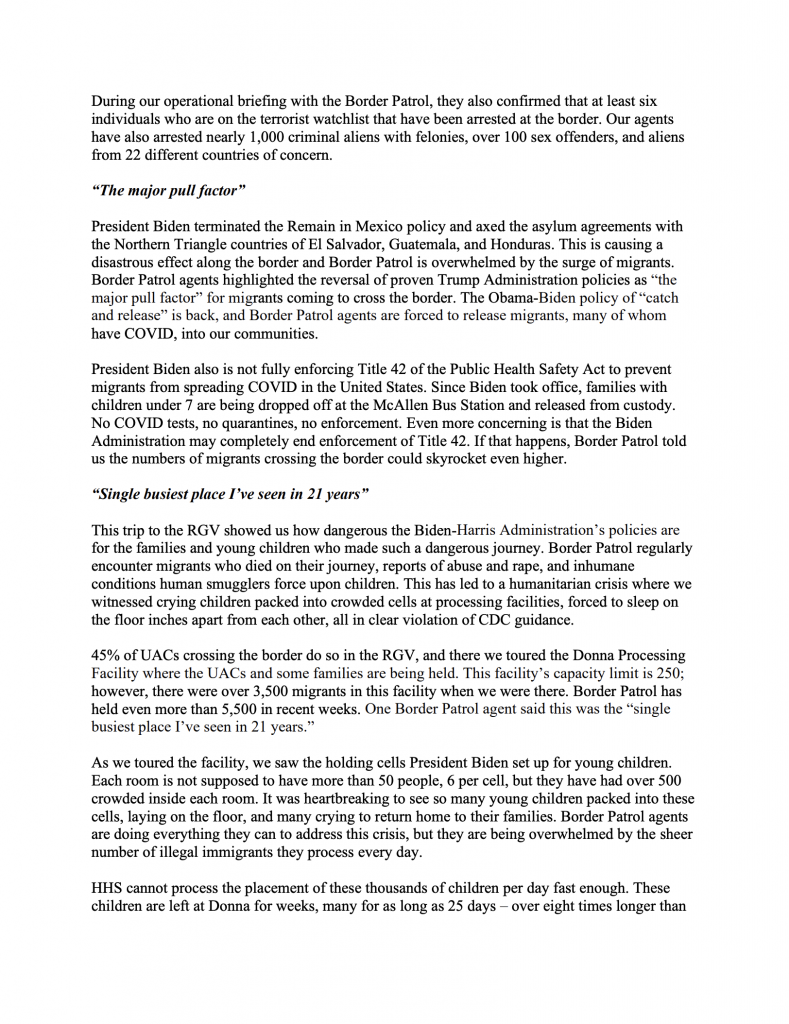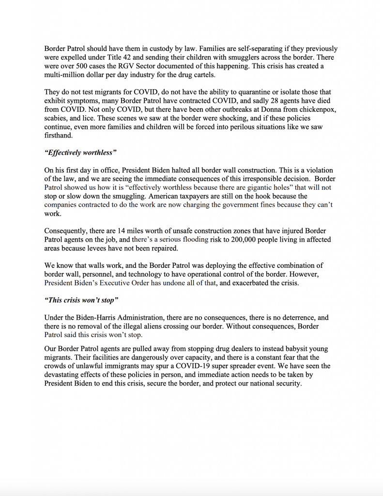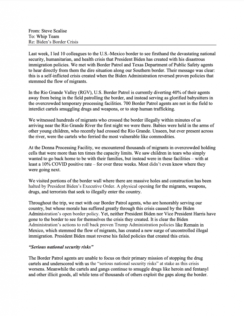 After leading a delegation of 10 Republican lawmakers to the border, House Republican Whip Steve Scalise (R-La.) sent a memo to his Whip Team detailing the horrifying things the Representatives witnessed on their trip. Whip Scalise criticized the Biden Administration for failing to address the ongoing humanitarian, health, and national security crisis along the U.S.-Mexico border and blamed President Biden’s actions and rhetoric for encouraging tens of thousands of illegal immigrants to unlawfully enter the United States. In his memo, Whip Scalise called on President Biden to end his self-made crisis, secure the border, and protect the American people.