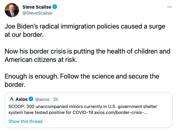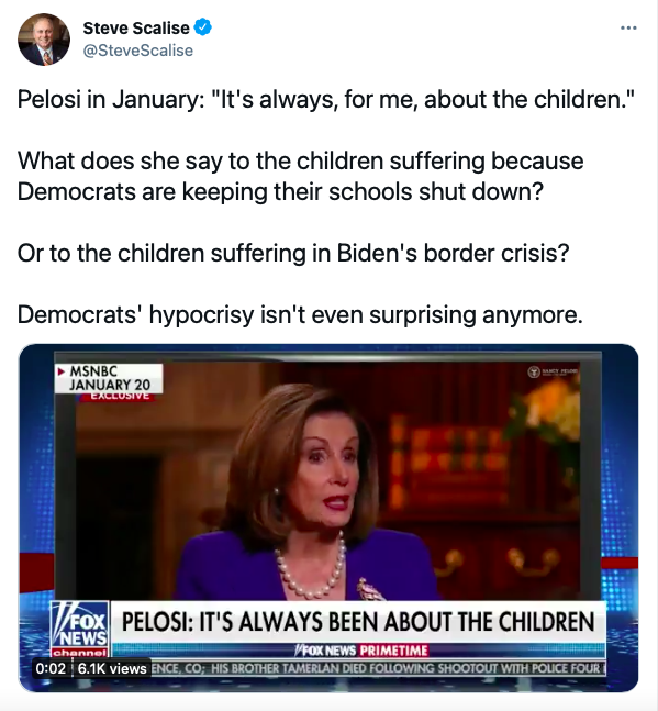 BOTTOM LINE: Children are paying the price because Democrats and the Biden Administration are refusing to address the problems their radical policies have created for kids. Speaker Pelosi should live up to her own words and work with Republicans to safely open our schools and solve President Biden’s self-made crisis at the border.
