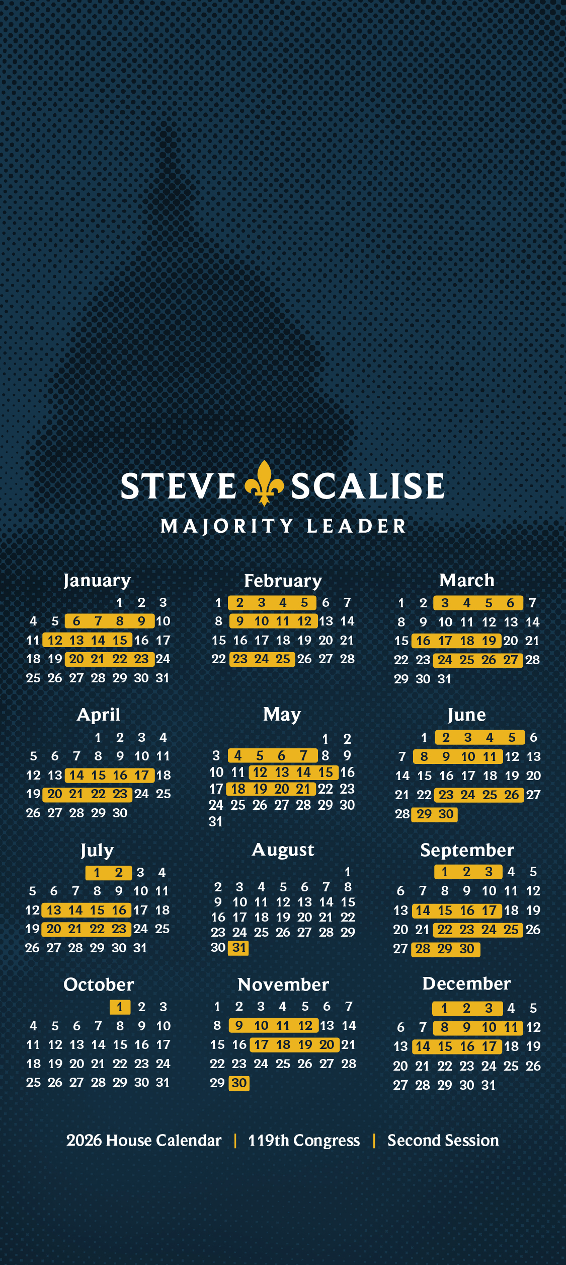 Today, House Majority Leader Steve Scalise (R-La.) announced the 2026 legislative calendar for the second session of the 119th Congress.