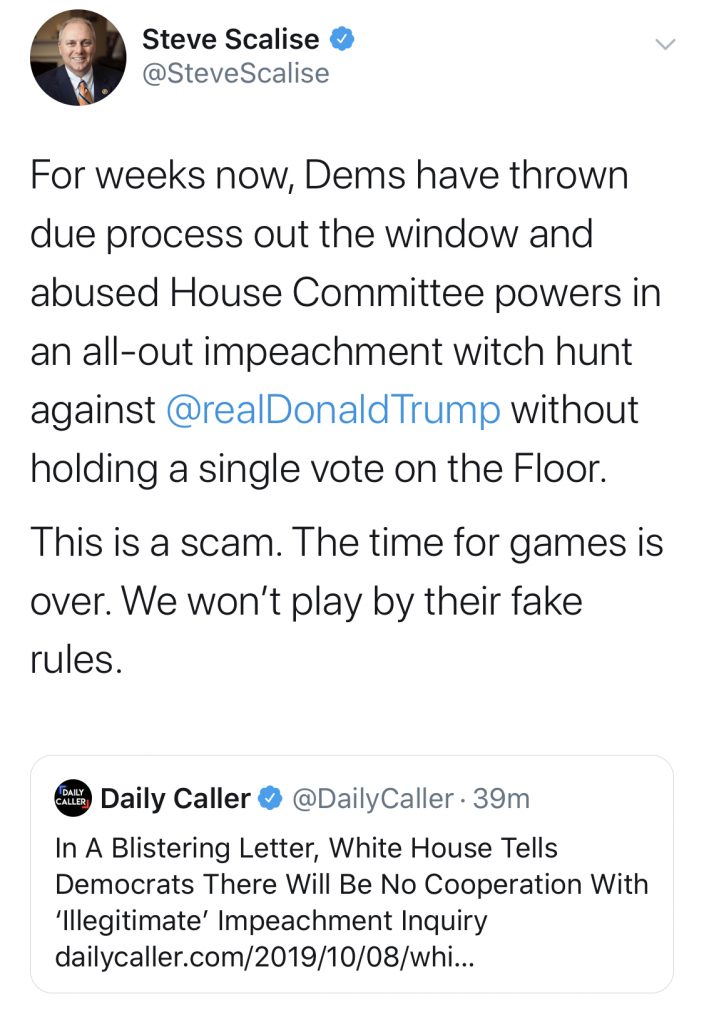 House Republican Whip Steve Scalise (R-La.) made the following comment on the White House’s letter to House Democrats on their sham impeachment process: